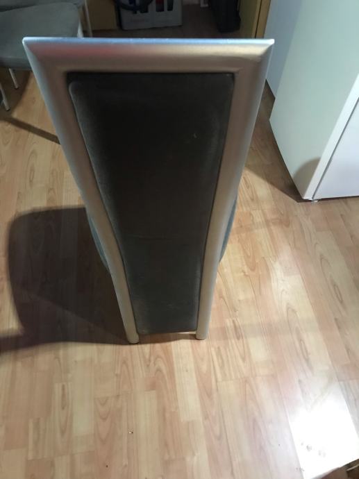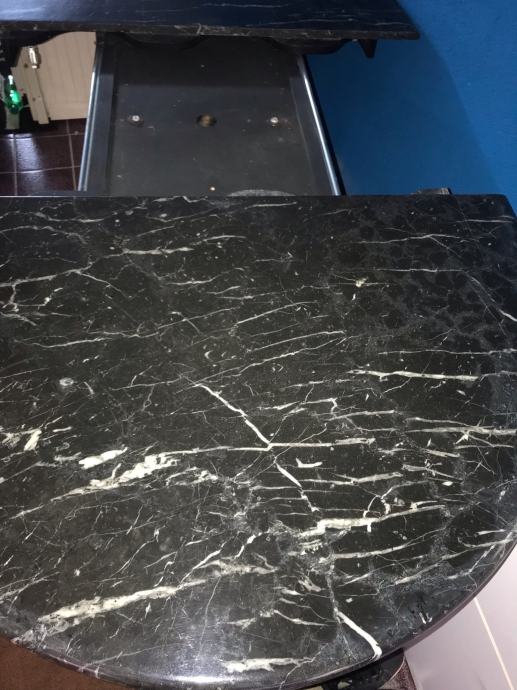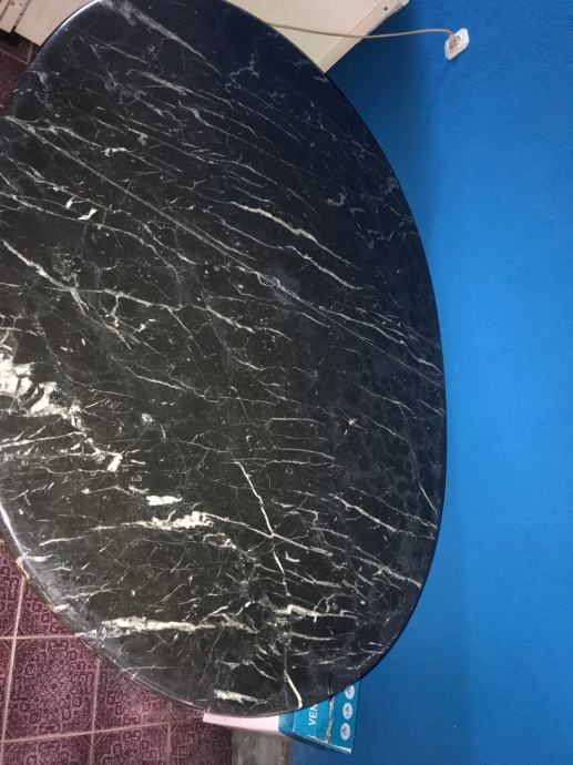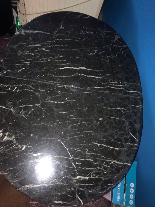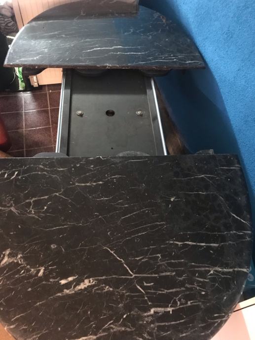 Stol na razvlačenje sa mramornom pločom i šest stolica metalnih , platno nije nešto extra , stol kad se razvuče između dođe crna drvena tabla