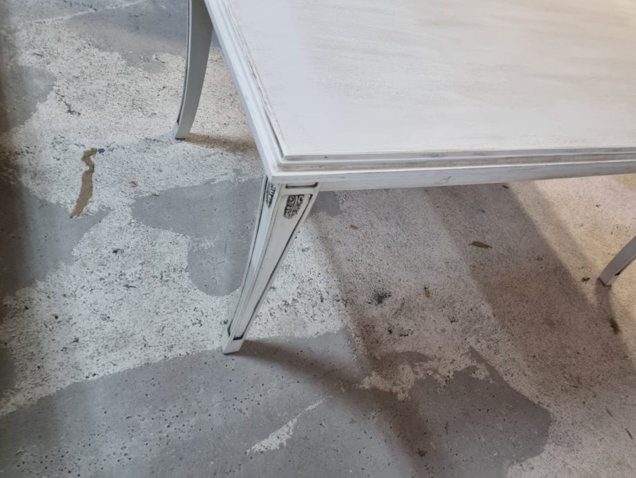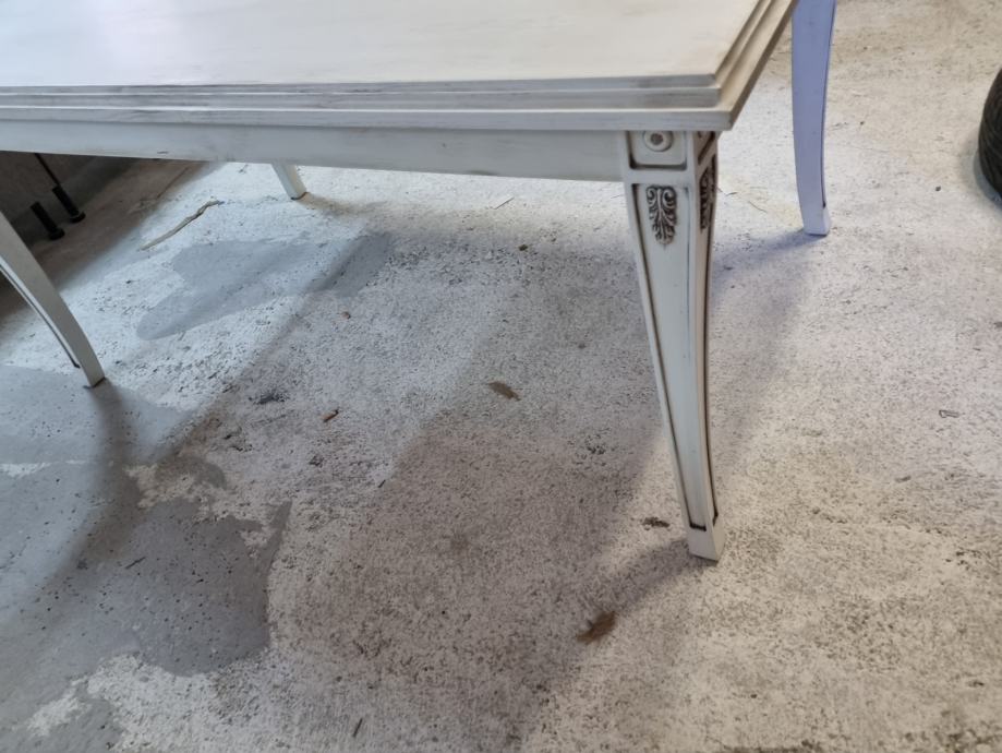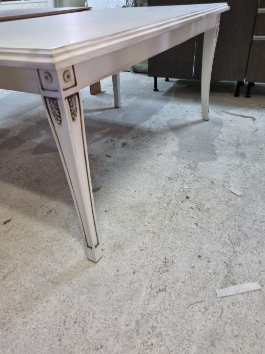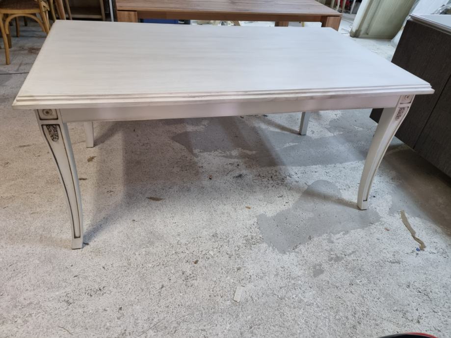 Prodaje se drveni stol dimenzije 165cm x95cm .Konstrukcija masivno drvo hrast lakirano u krem-antik boja.(panna sa patinom antiko).Ploča sa ukrasnim stilski rukom.. noge izrađene sa ornamentom..stol potpuno nov i savršen
