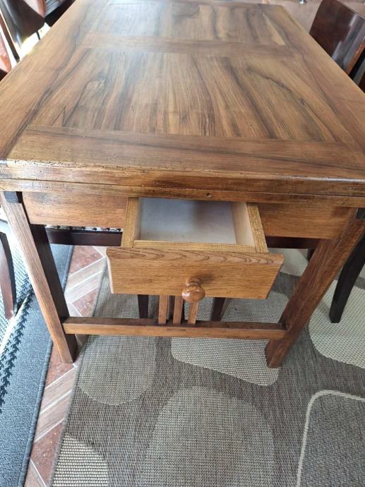 Stolić je čvrst i stabilan, ima praktičnu ladicu za odlaganje. Vidljivi su manji tragovi korištenja na rubovima, ali je u dobrom stanju. Stol se može raširiti Uz njega mogu se uzet i stolice na drugom su oglasu.