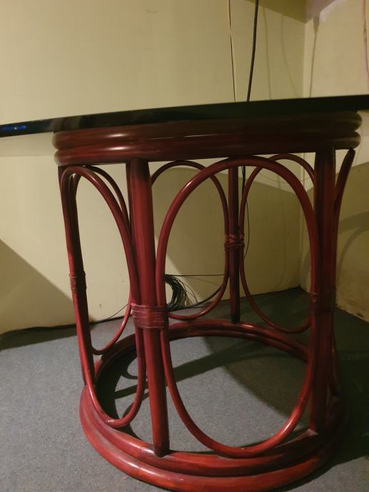 Promjer stola je 120. Postolje od bambusove trske, u boji mahagonije. Staklo debljine 2cm.