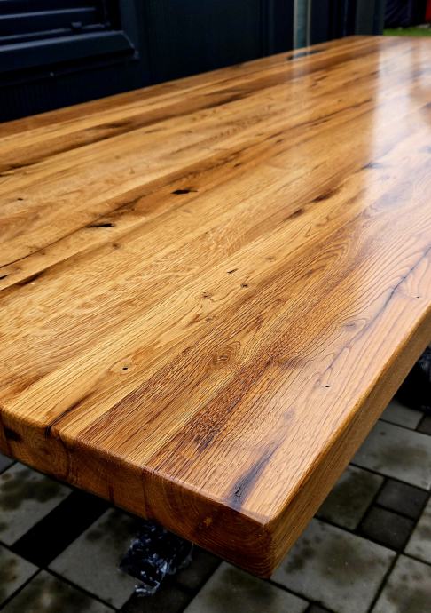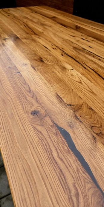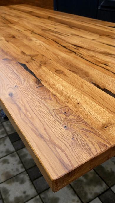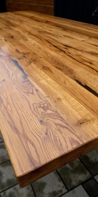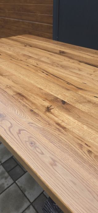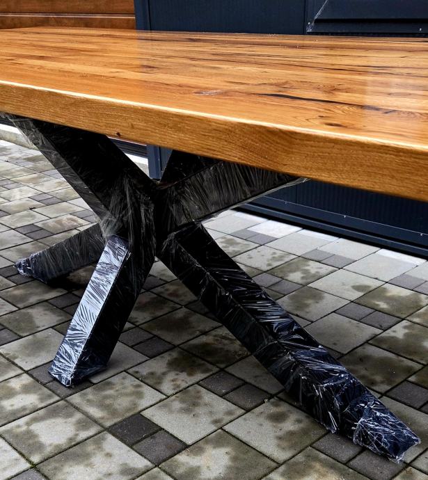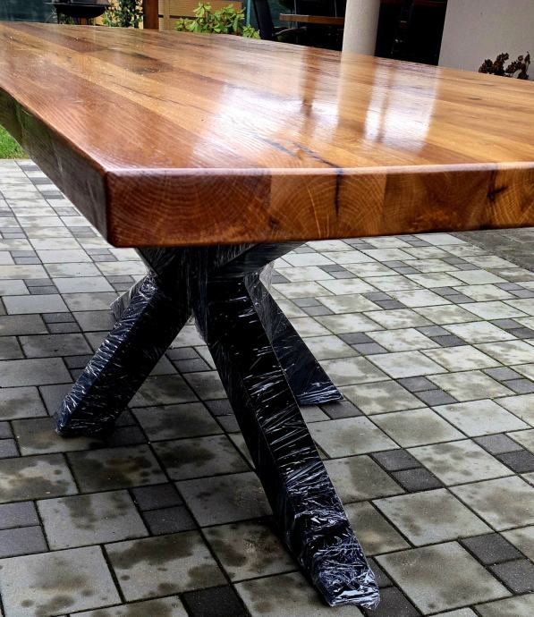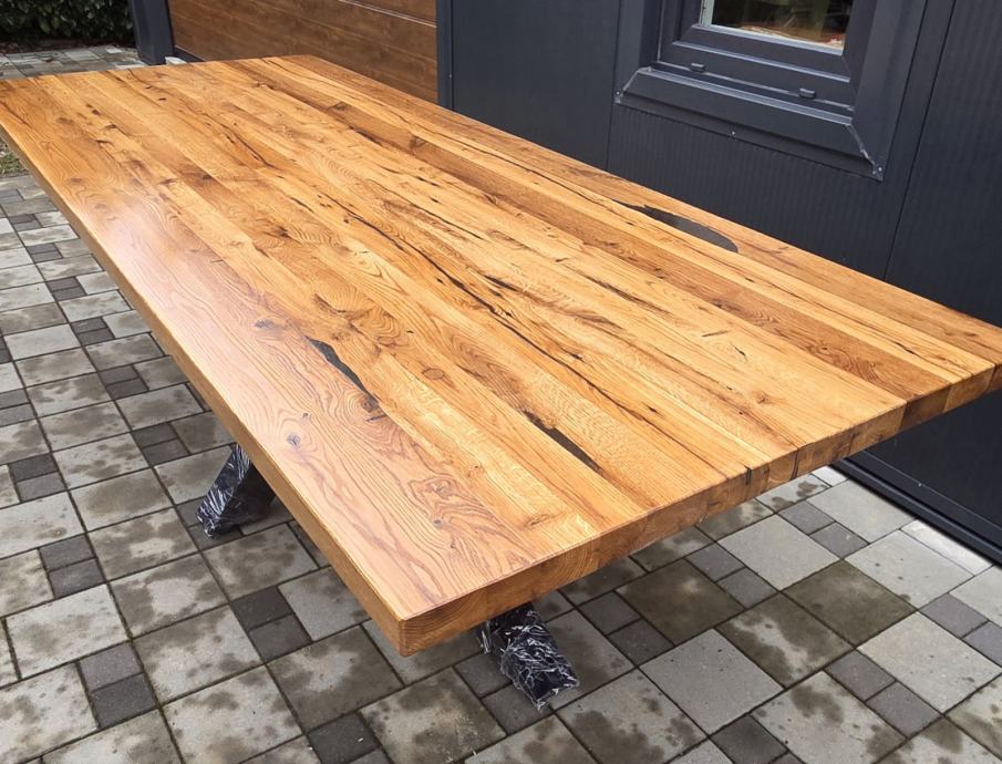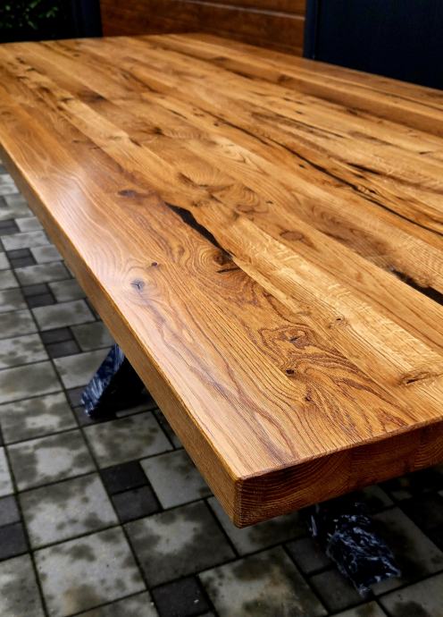 Stol dimenzija 250 x 100 cm debljine daske 5 cm izrađen iz stogodišnje stare hrastovine. Masivne metalne nogare savršenih proporcija u odnosu na masivnu dasku. Nogare iz kvadratnih cijevi 100x100mm plastificirano crnom mat plastifikacijom.