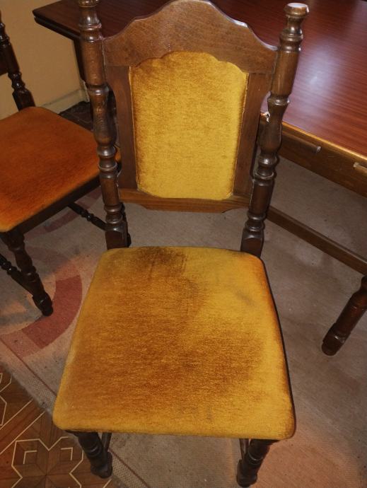 PRODAJE SE STOL KOJI SE RAZVLAČI I 6 STOLICA KOMPLET ZLATNO ŽUTE BOJE MALO KORIŠTENO ALI OČUVANI MASIVA 400 eura OSTALO NA UPIT 091 768 4066 SLIKE U PRILOGU + DIMENZIJE STANDARD