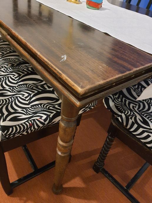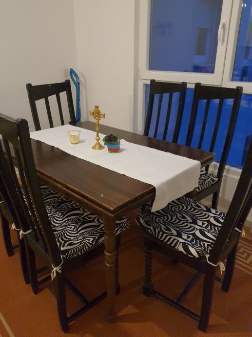 Prodajem stol 120x85cm sa funkcijom razvlačenja i stolice 6 kom. Sve je puno drvo. Stolice su ručni stolarski rad, ali nedovršene (vidljivo po sjedištu). Stol se može razvući još 35cm sa svake strane.