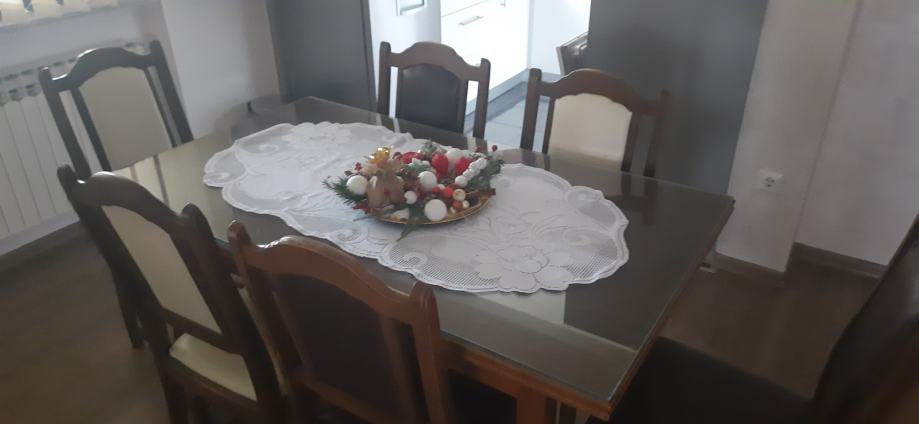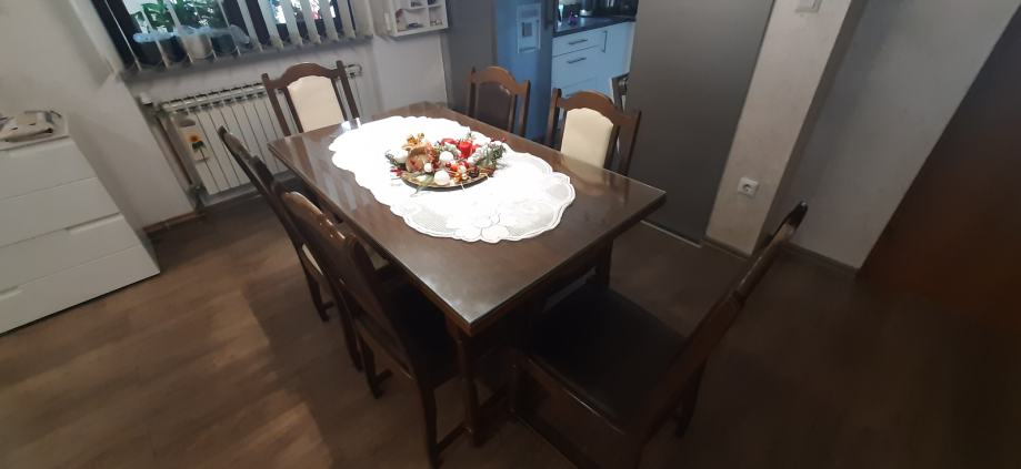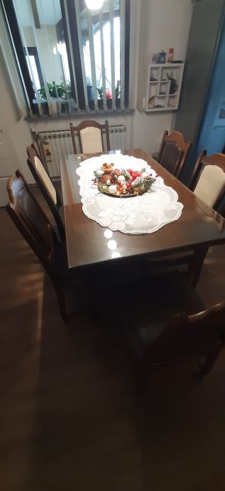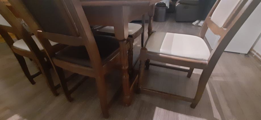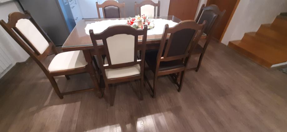 Prodajem blagovaonski stol 135 x 77 cm na razvlačenje (211 x 77 cm) i 6 stolica u kompletu, izvrsno stanje, drvo kestena sa vrhunskom, rustikalnom obradom, ručni rad, troslojno lakirano. (UNIKAT)