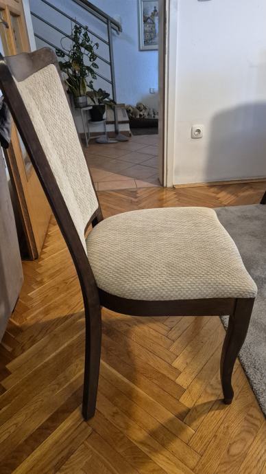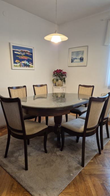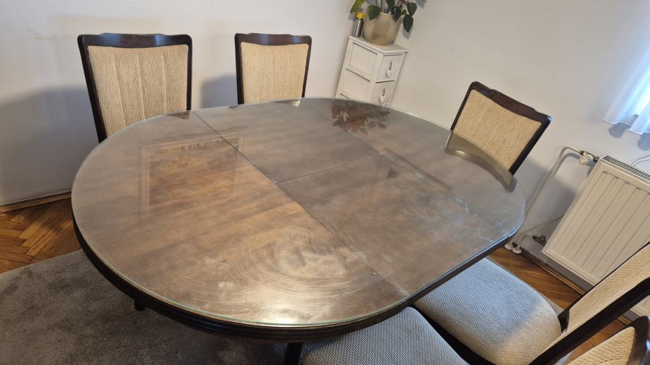 Prodajem rabljeni drveni stol i 6 stolica za blagovaonu u dobrom stanju, s malim ostecenjima. Dimenzija stola je fi 110cm (razvucen 150cm). Koristen je u razvucenoj formi pa uz to dolazi i zastitno staklo za stol u dimenziji razvucenog stola.