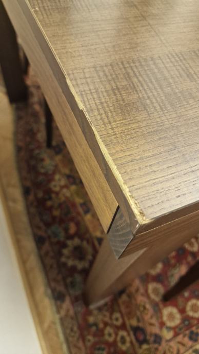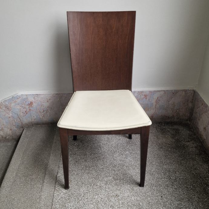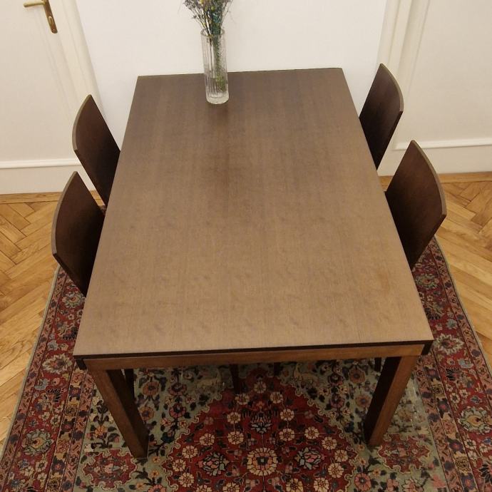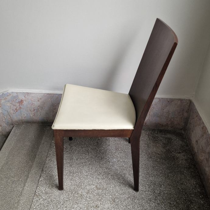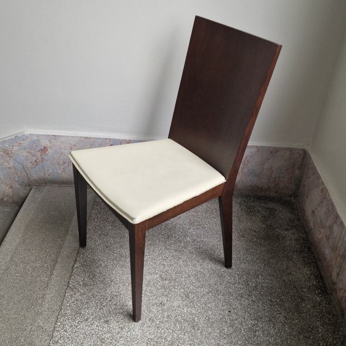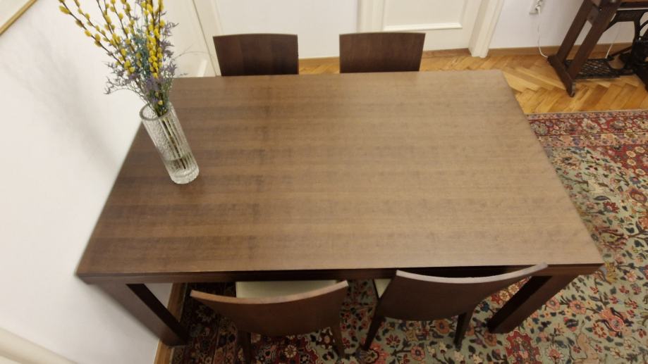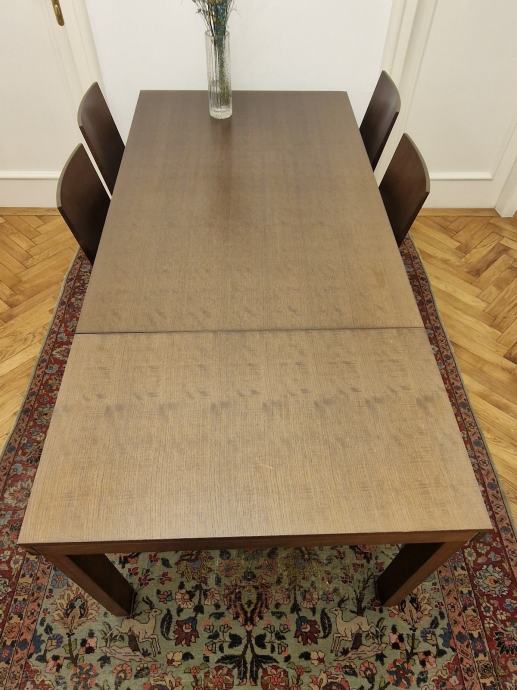 Rabljeni blagovaonski stol i stolice Calligaris. Stol na razvlačenje 100x160(220). Oštećenje na bridu stola. Stolice s kožnom sjednom površinom, 8 komada (na slici su četiri). Vidljivi znakovi korištenja, ali sve u reprezentativnom izdanju. Vrhunska kvaliteta.