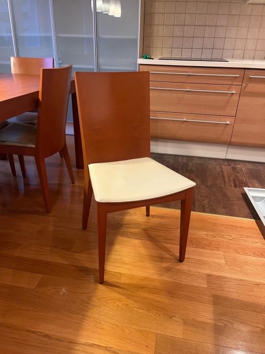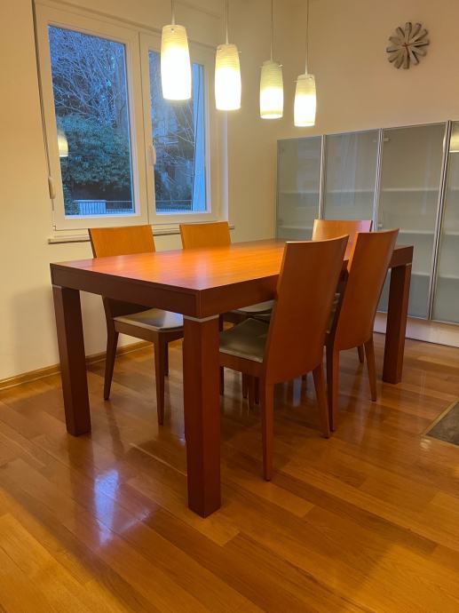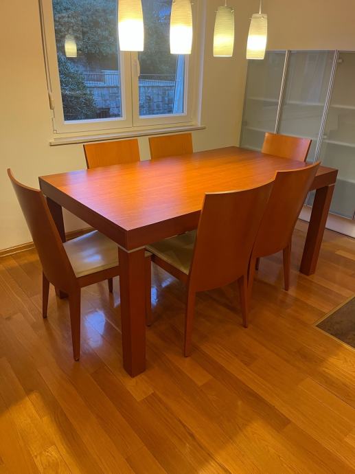 Stol i 6 stolica u izvrsnom stanju. Dimenzije stola su 160x90 cm. Stol se moze produziti na 260 cm. Kupac rjesava odvoz namjestaja