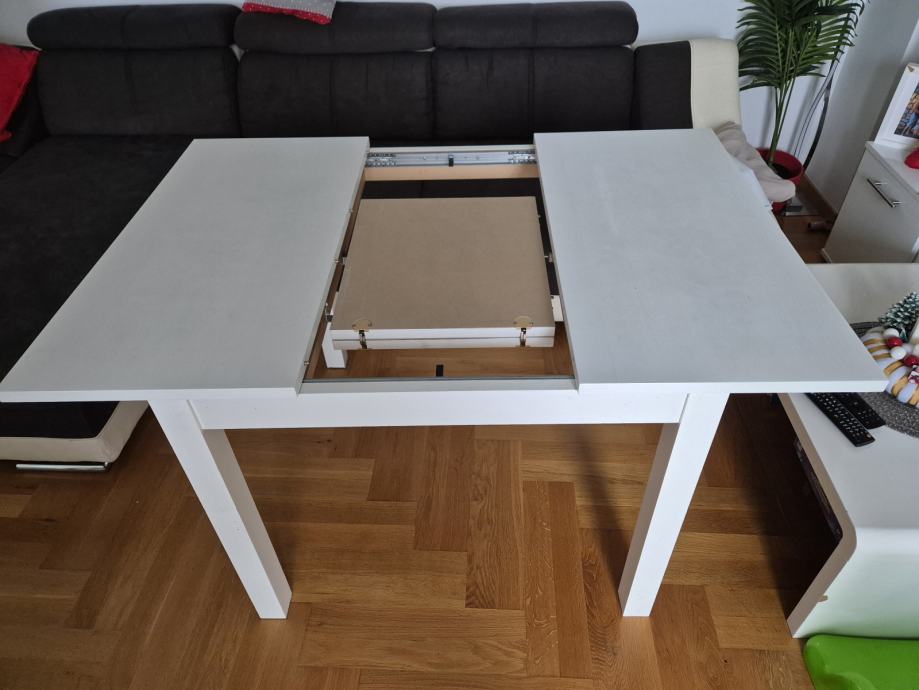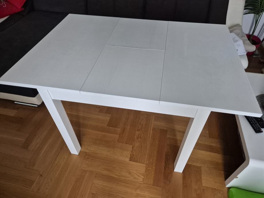 Nisam baš bio pametan, pa sam spakirao stol prije nego sam zapisao mjere, no mislim da je 80x80, produživ do 120cm. Prema potrebi potvrdim dimenzije skupljenog stola.