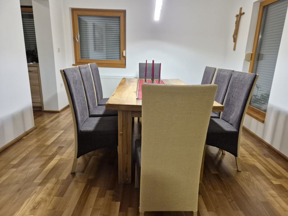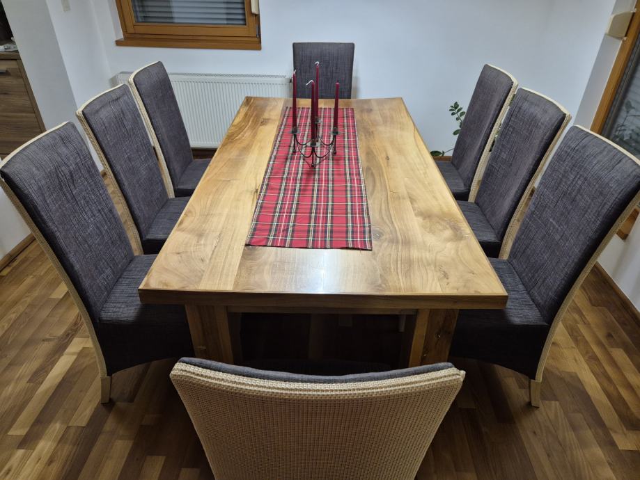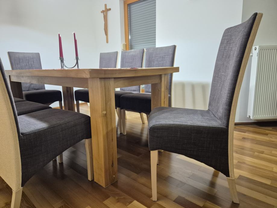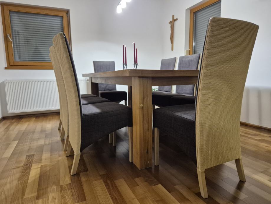 Prodajem u kompletu ili zasebno stol i 6 stolica. Stolac, kombinacija prirodnog ratana i tamno smeđe tkanine. Stol, boja starog oraha (pravo drvo).