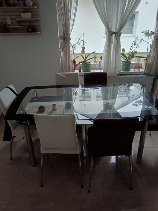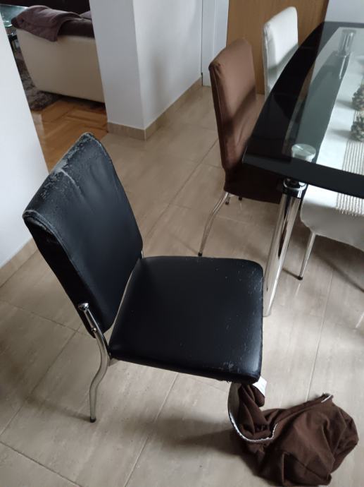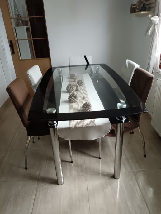 Stakleni stol sa metalnim nogama, dužina 160 cm, širina 90 cm i šest stolica sa metalnim nogama. Sjedalo i naslon od eko kože koje bi trebao promjeniti ili presvući.