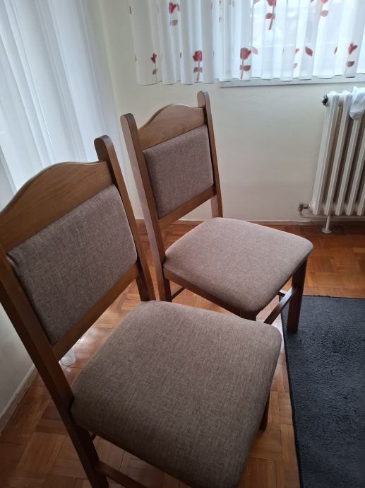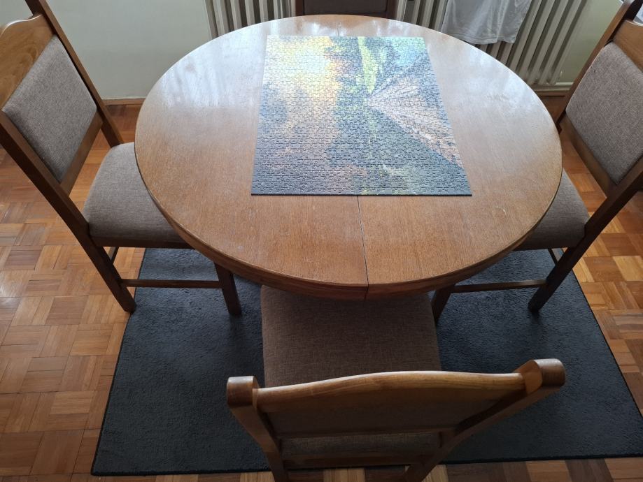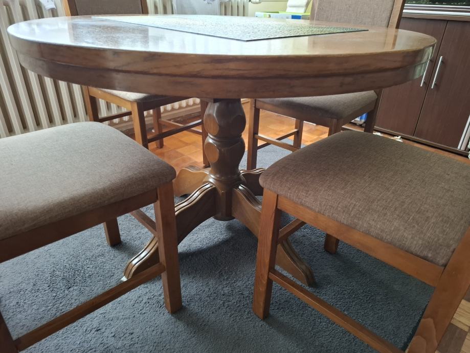 Okrugli stol na razvlačenje i 4 stolice,u dosta dobrom stanju,stol je puno drvo. Uz stol i staklo koje trenutno nije na stolu.