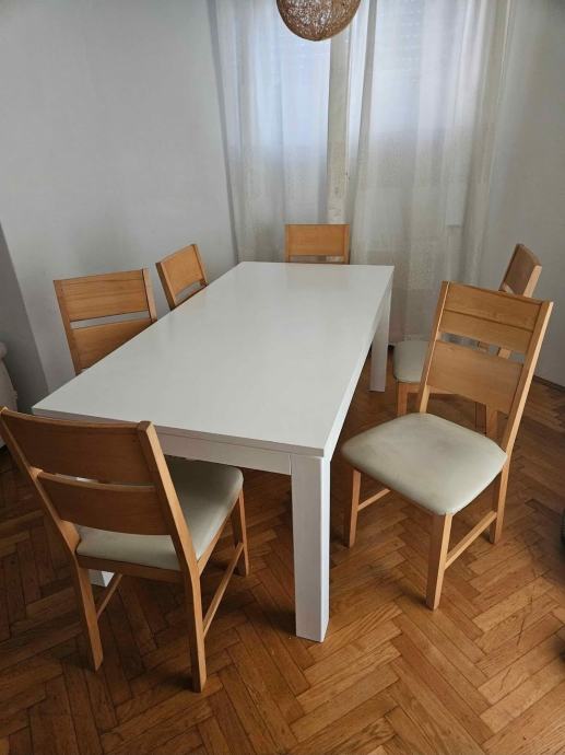 Stol puno drvo, gornja ploča medijapan širine 90cm, nerazvučen 180cm, može se povećati na 230cm i 270cm za 300eura. Stolice puno drvo bukva 6x50eura. Moze zamjena za razno slobodno ponudite. Samo osobno preuzimanje.