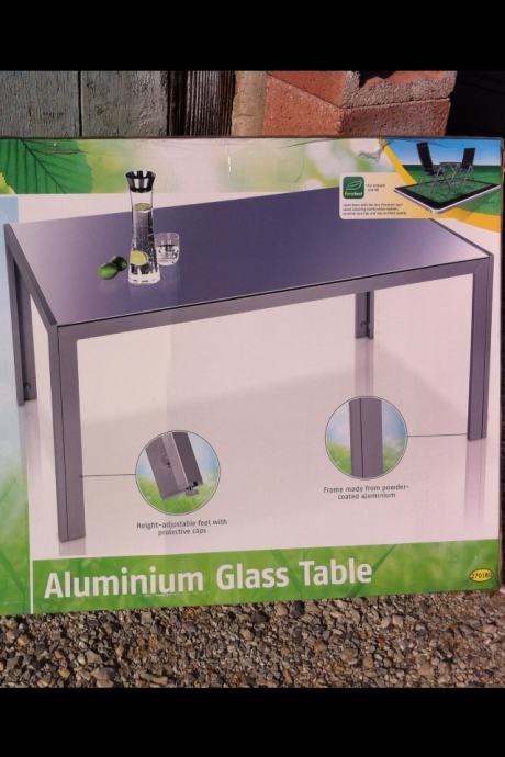 Potpuno novi stol, vrhunskog izgleda i moderan, moze biti za van na terasi ili unutarnji. Aluminijski nehrđajuci okvir i kaljeno raflektirajuce staklo. Štelajuce nogice, šeraf na čepu nogice. Otporan na sve vremenske uvijete. Akcija, moguca zamjena razno, bilo sto korisno. Moguc prijevoz! 1000kn. Info na mob; 099 3395 999