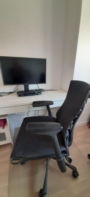 Uredska stolica najviše kvalitete. Prati konture tijela sa nekoliko tipki i poluga za namještanje položaja naslona leđa, lumbalnog dijela, naslona ruku, visine sjedenja, dužine sjedala i ostalih funkcija... Komplet je crne boje. Korištena je doma i rijetko te je nakon nekoliko mjeseci pokrivena i smještena u ostavu. Zato se prodaje, jer zauzima mjesto i nije nam više potrebna. Što se tiče održavanja, svi dijelovi su dostupni preko uvoznika tj. Ako se nešto slomi, može se naručiti. Stoga je ova stolica najbolja investicija koja ne može više izgubiti na vrijednosti. Trenutno stanje je 9/10 zbog nekoliko ogrebotina na plastici.