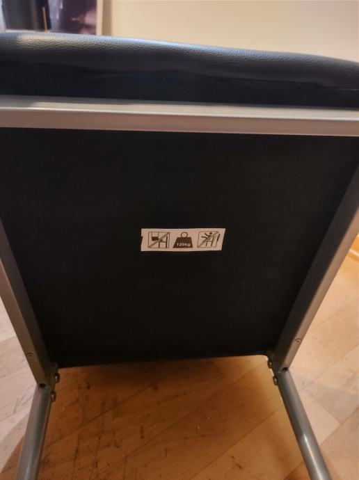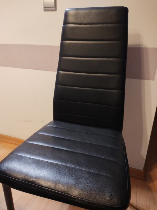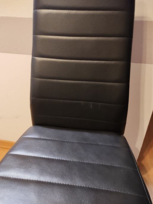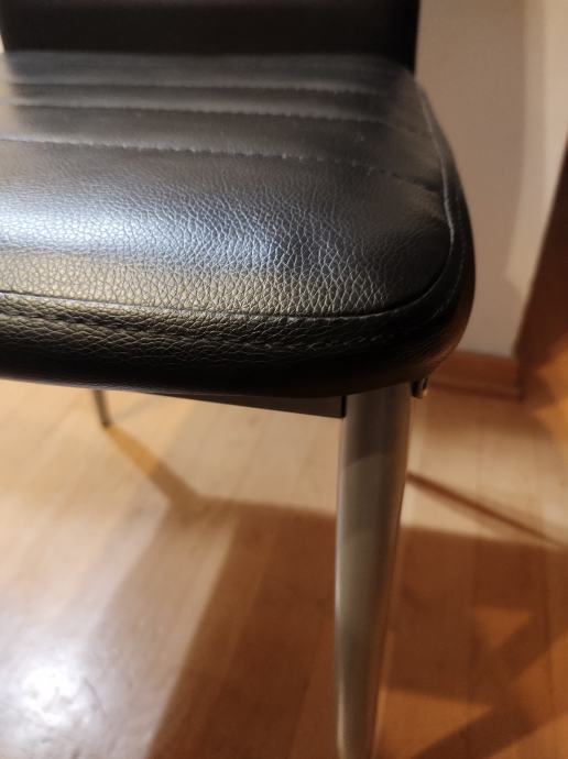Crne, jednostavne. Umjetna koža, nigdje nije popucala i ne ljušti se (bile pod navlakama) Metalne srebrne nogice. 40,5x41x100cm. Stanje je dobro jer spojevi izmedu sjedala i konstrukcije popuštaju, vjerojatno treba promijeniti šrafove. To nista ne smeta za sjedenje.