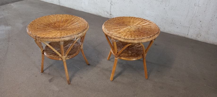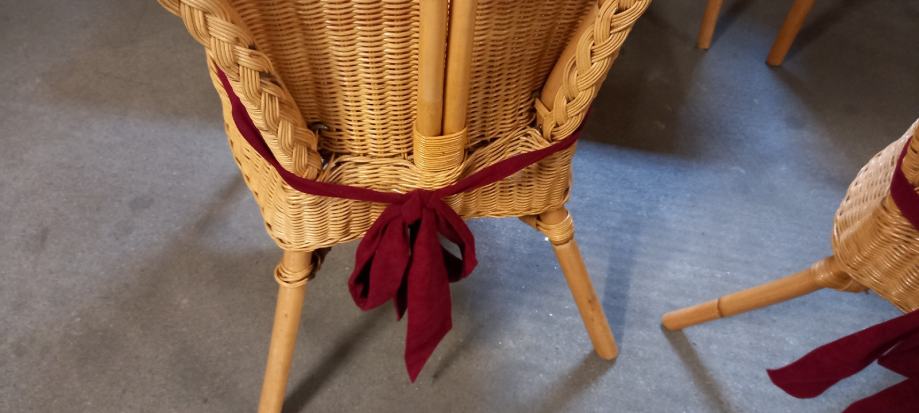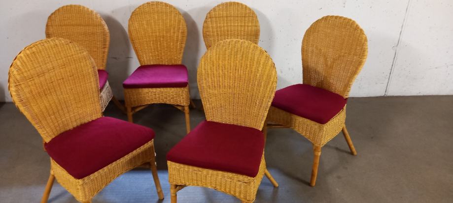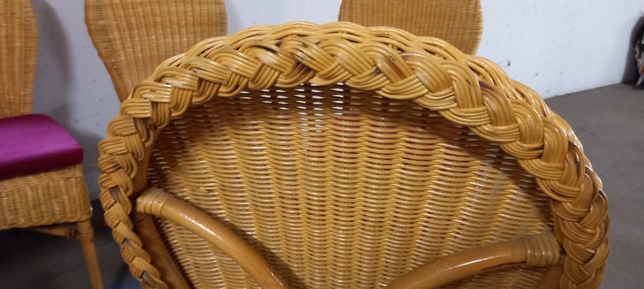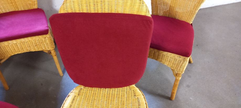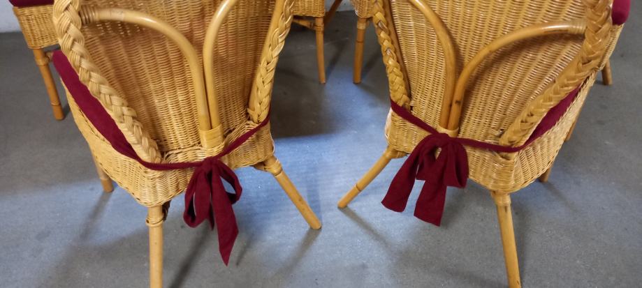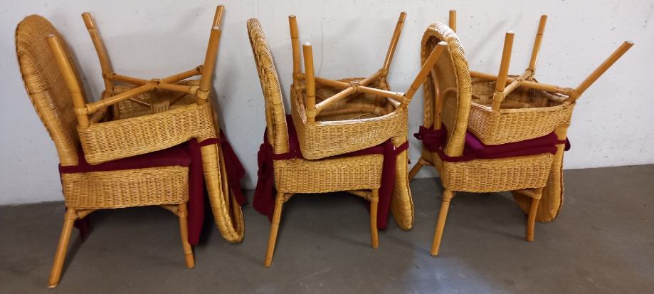 2. "Bambus" stolci (kom. 6 pleteni) pleteni i crvenim podloška. Stolci su u 4 + stanju.uz stolce idu 2 kom. mala bambus pletena stola