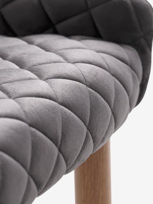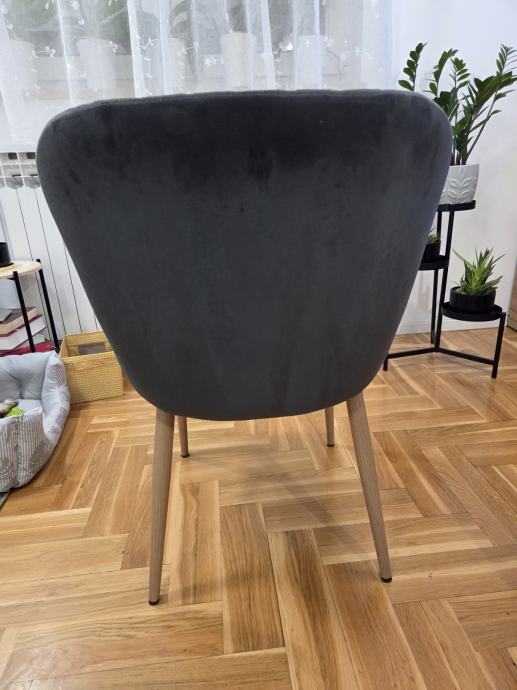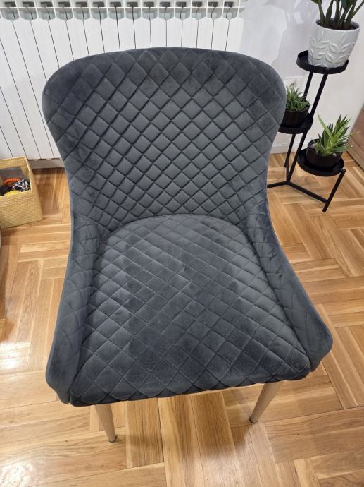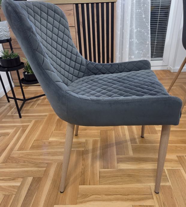 Blagovaonska stolica s podstavljenim sjedalom i naslonom od sive baršunaste tkanine. Noge od čelika s izgledom hrasta.