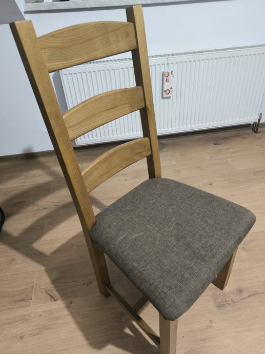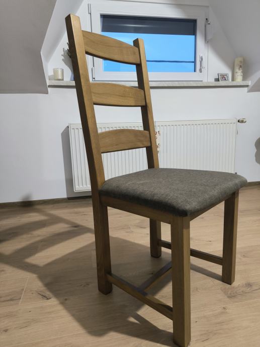 Prodajem 6 stolica od hrasta, ukupna visina 101 cm, visina sjedišta 42 cm i dubina sjedišta 44 cm. Tkanina sive boje na sjedištu. Stolice su korištene ali u očuvanom stanju. Cijena po komadu.
