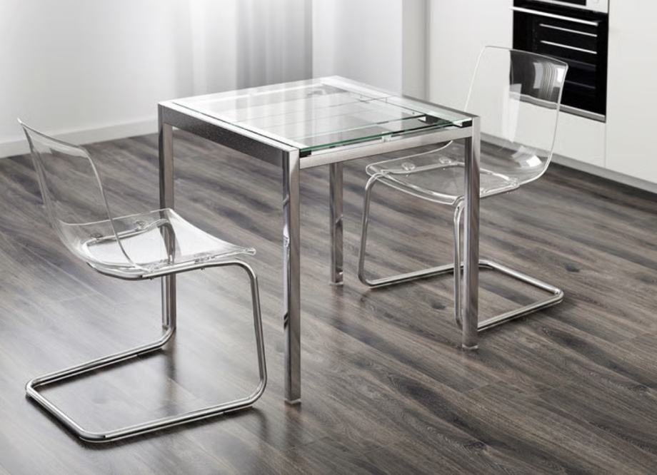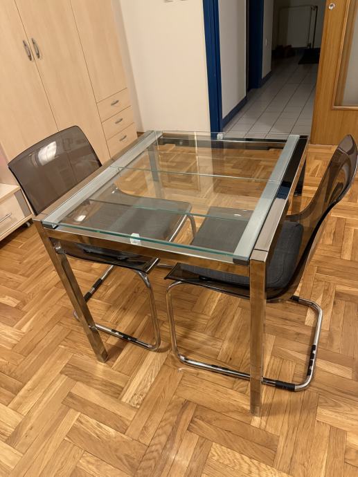 Moguće je uz stolice kupiti i produljivi stol - IKEA: GLIVARP (transparentna/kromirano, 75/115x70 cm).