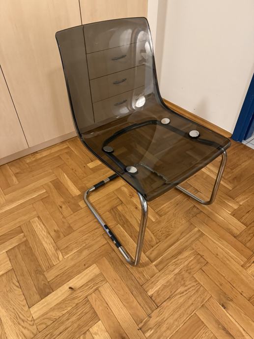Prozirno-siva stolica koja odražava svoju okolinu. Skuplja boje sobe i djeluje kao da lebdi.