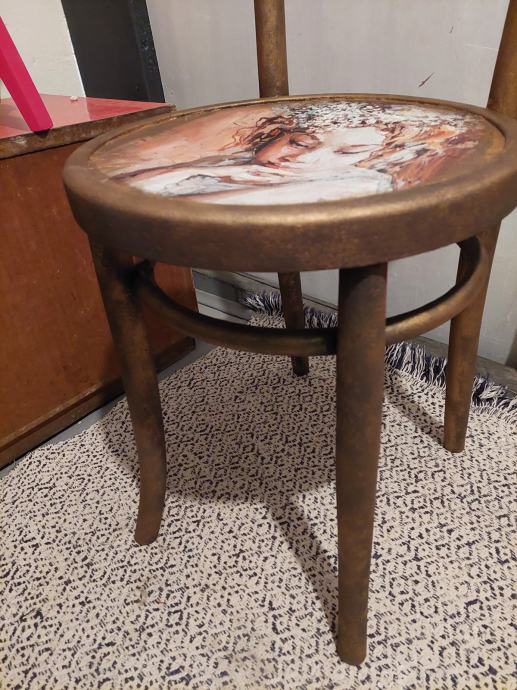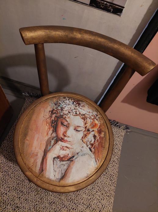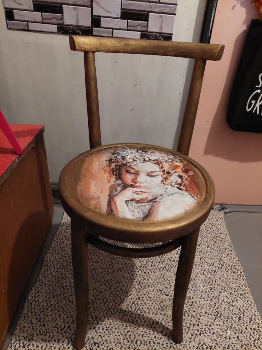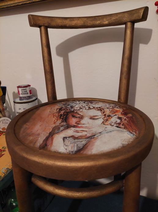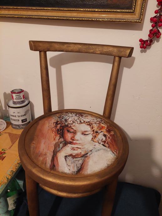 Renovirana stara stolica, bojana Annie Sloan bojama i voskom, te rađeno tehnikom dekupaž.
