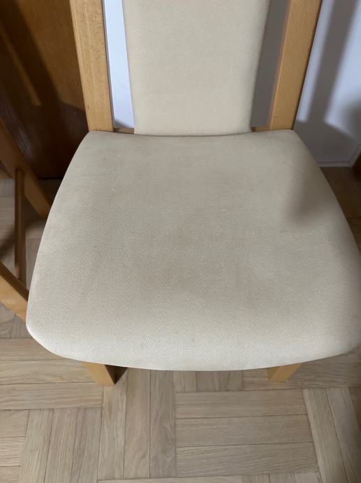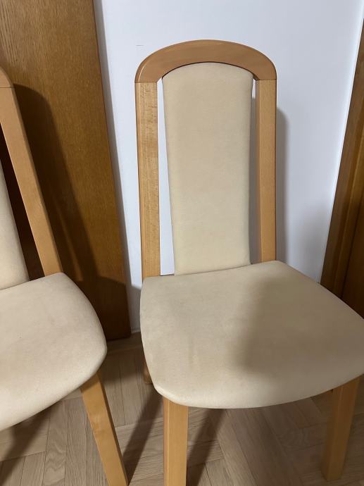 Prodajem dvije blagovaonske stolice s drvenim okvirom u svijetloj, bukovoj boji. Sjedišta i nasloni za leđa presvučeni su tekstilom u krem boji. Stolice su solidne i stabilne, klasičnog dizajna koji se uklapa u različite blagovaonske uređaje.