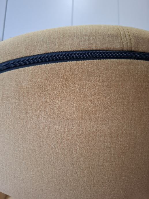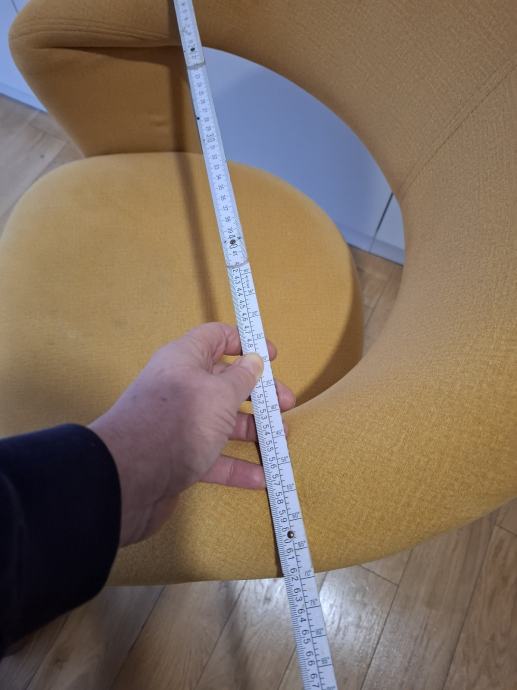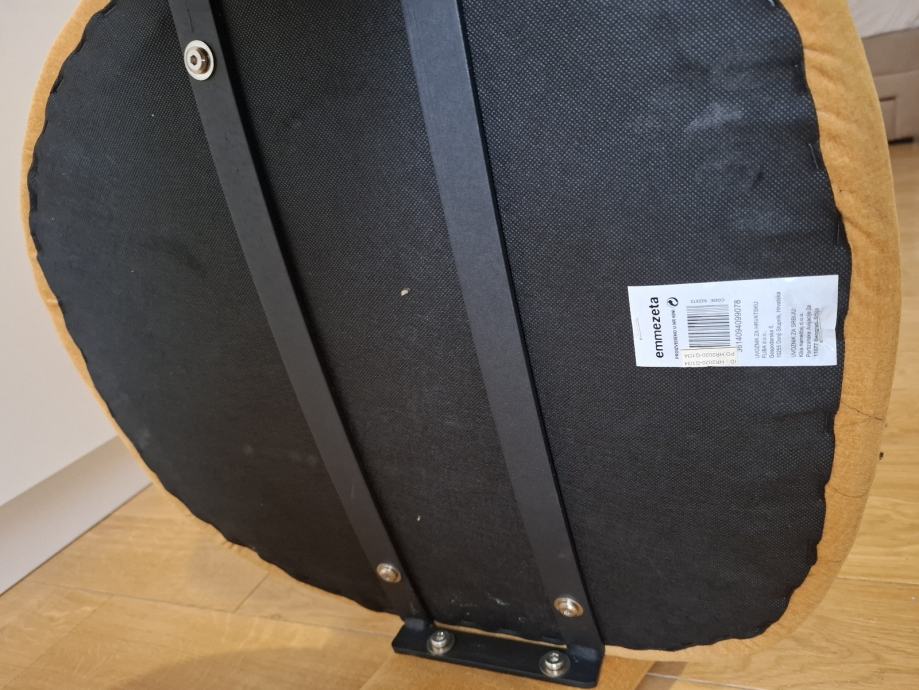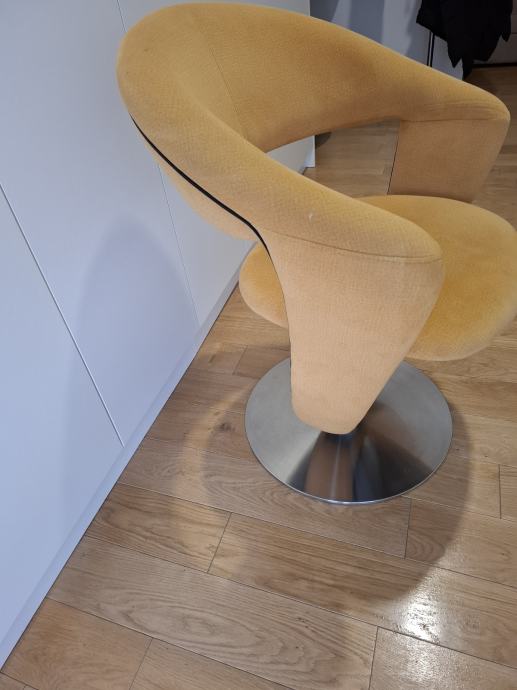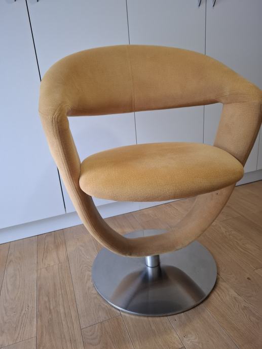 Prodajem dvije dizajnerske stolice s okruglom, zaobljenom formom i mekanom presvlakom u toploj žutoj, okerboj boji. Stolice imaju karakteristični otvoreni naslon u obliku luka te sjedalo s metalnom nogom od nehrđajućeg čelika u obliku diska. Prodaju se kao lot od 2 komada.