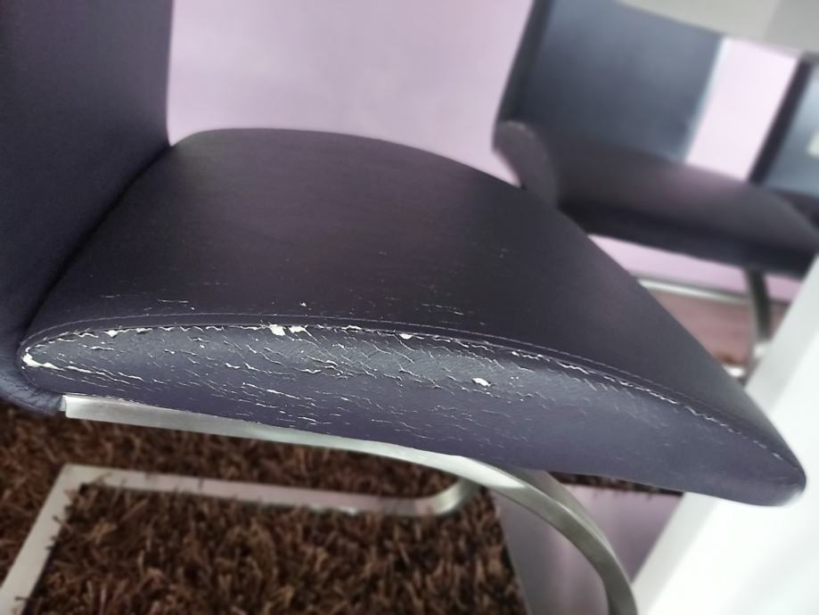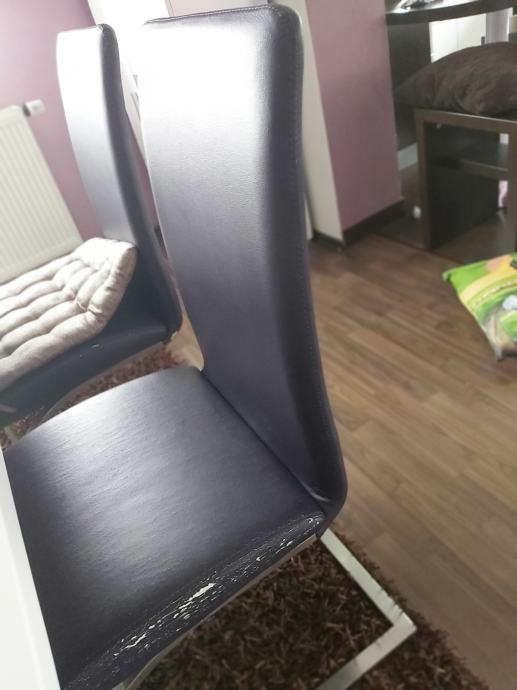 Stolice tamno ljubicaste boje, ukupno 8 kom,.jako malo korištene, stajale su pa se koža oljuštila na sjedištu, druga oštećenja nemaju. Noge u boji kroma, jako su praktične i udobne.