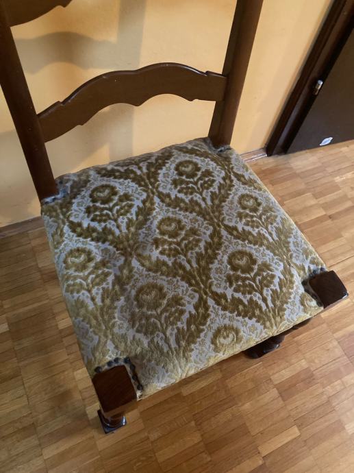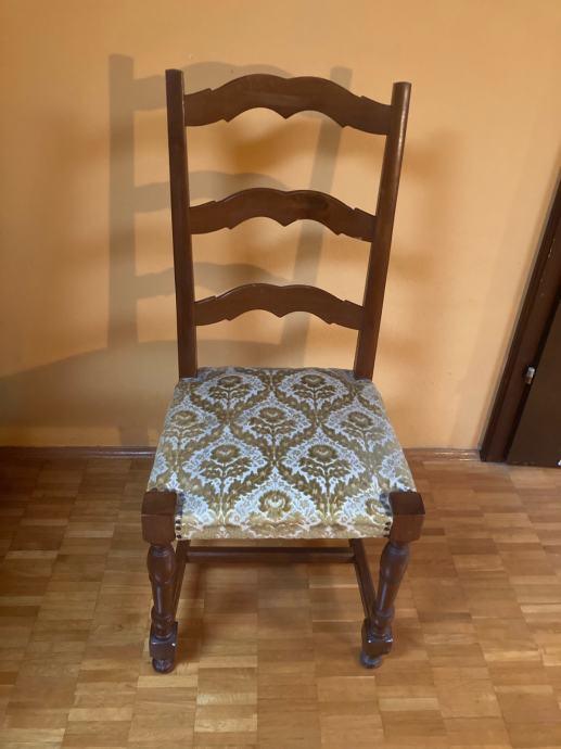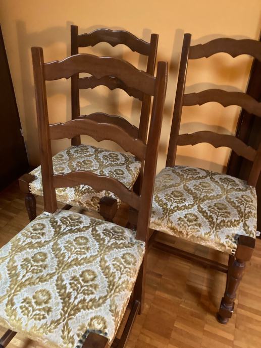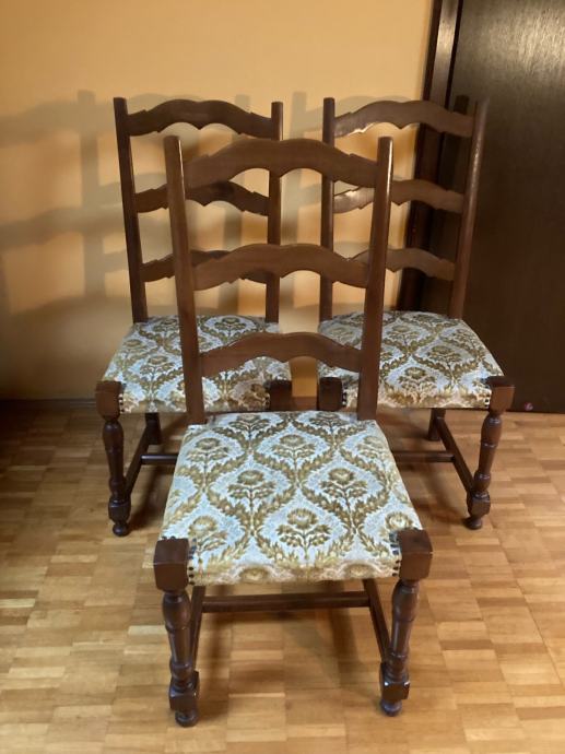 Prodajem set od tri drvene blagovaonske stolice klasičnog dizajna. Izrađene su od masivnog drva tamnije boje, s karakterističnim leđnim naslonom. Sjedišta su tapecirani tekstilom s cvjetnim uzorkom.