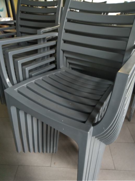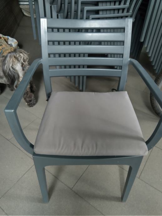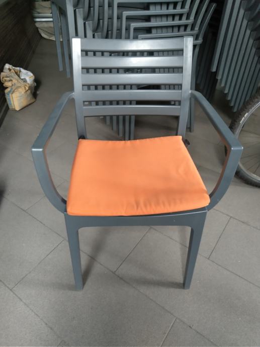 Ugostiteljske stolice sive plastične u kompletu sa narančastim i sivim jastucima.