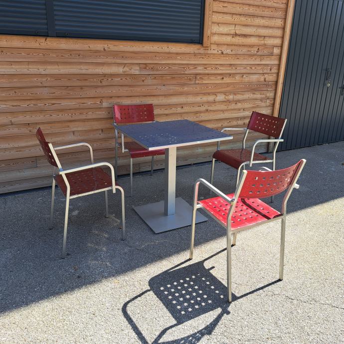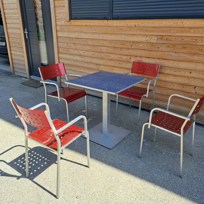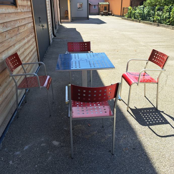 Prodajem stol i 4 stolice, konstrukcija željezna, sjedište i naslon su od aluminija. Za terasu ili unutarnji prostor.
