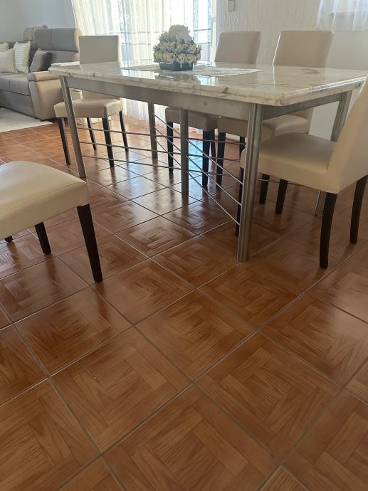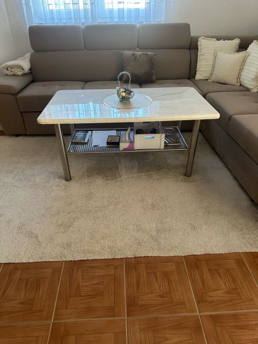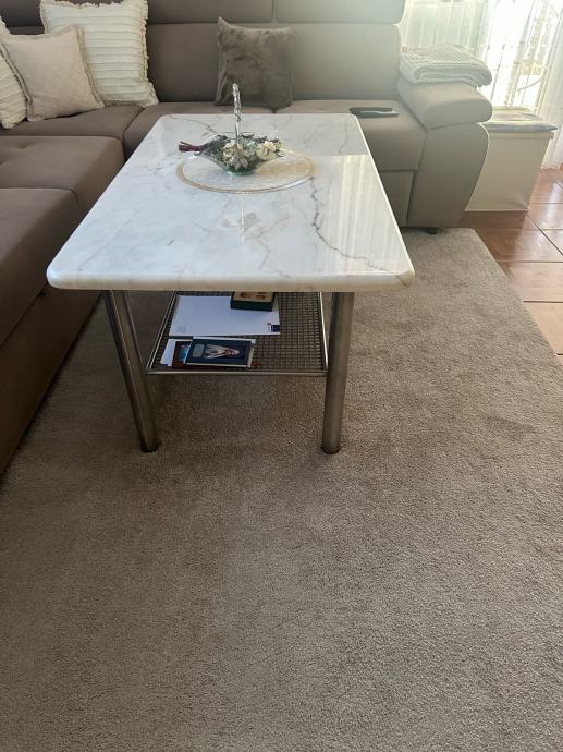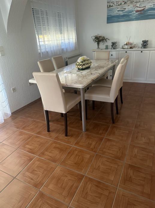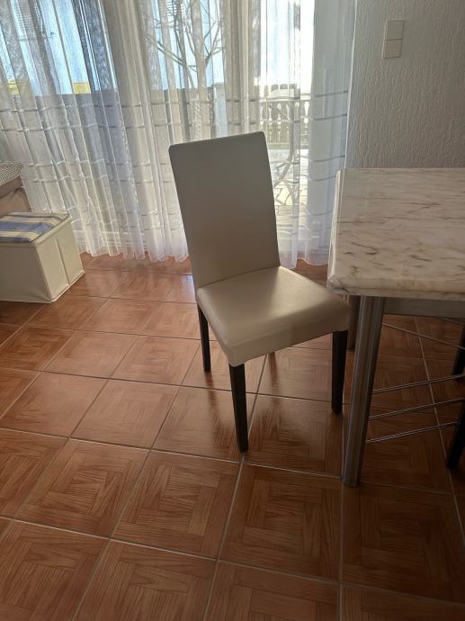 Mramorni kameni blagovaonski stol sa šest stolica umjetna koža (skaj) postolje stola od inoxsa dimenzije:D 185xŠ90xV75 cm ne razvlači se i mali salon stolić od istog mramora postolje isto od inoxsa dimenzije D:120x70x50 cm u paketu