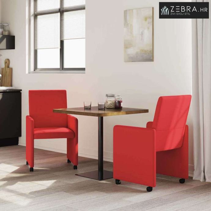 Umjetna koža: Stolice su obložene kvalitetnom umjetnom kožom koja izgleda odlično i lako se čisti. Ovaj materijal je otporan na mrlje i trošenje, što ih čini praktičnim izborom za zauzete kuhinje i blagovaonice svejedno zadržavajući moderan izgled. Bočni nasloni: Ovi bočni nasloni nude idealno mjesto za odmaranje ruku i savršeno se uklapaju u dizajn stolice. Omogućuju udobno sjedenje i podržavaju ergonomski način sjedenja tijekom dugih obroka ili druženja. Udobnost s pjenastim punjenjem: Mjesta su obložena pjenom koja pruža udobnost i dobru podršku. Pjena je lagana, ali efikasna, i osigurava ugodnu sjedeću poziciju kroz cijeli obrok. Mobilnost s kotačićima: Stolice dolaze s kotačićima, što znači da se lako pomiču po blagovaonici. Bilo da preručujete ili jednostavno želite malo pomaknuti stolicu, ovi kotačići olakšavaju kretanje. Laka montaža: Postavljanje ovih stolica je super jednostavno i zahtijeva samo odvijač. Uz jasne upute, brzo ćete uživati u svojim novim stolicama za blagovanje. Boja: Crvena