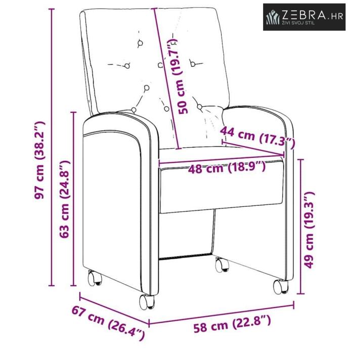 Površina od premium baršuna Ove stolice imaju luksuznu baršunastu tkaninu koja se glatko osjeća pri dodiru, čineći svaki prostor privlačnijim. Baršun dodaje blagi sjaj i bogatu teksturu, pa su ove stolice klasičan izbor za svaki blagovaonski prostor. Materijal se lako održava i osigurava dugotrajnost. Ergonomski dizajn naslona Oblik naslona poboljšava vašu posturu i smanjuje opterećenje tijekom dugog sjedenja. Ova funkcionalnost nudi dobru podršku, čineći ih izvrsnim izborom za blagovanje, bilo s radom, opuštanjem ili ugostiteljstvom. Oblik stolice se prilagođava vašem tijelu za maksimalnu udobnost. Stabilan okvir od šperploče i metala Čvrst okvir kombinira šperploču i metal, pružajući stabilnost i dugotrajne performanse. Odabrani materijali podržavaju veću težinu i dodaju stilsku eleganciju. Kotači za mobilnost Ove stolice dolaze s kotačima, pa ih možete lako pomicati po prostoru, olakšavajući aranžiranje. Bilo da premeštate za večeru ili čisteći, kotači omogućuju jednostavne promjene bez podizanja. Laka uputstva za njegu Održavanje ovih stolica je jednostavno s redovitim suhim čišćenjem. Usisavanje ili nježno četkanje pomaže očuvanju površine. Za mrlje izbjegavajte jake kemikalije i koristite nježne sredstva za čišćenje tkanina za dugovječnost i ljepotu. Boja: Krema