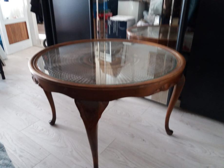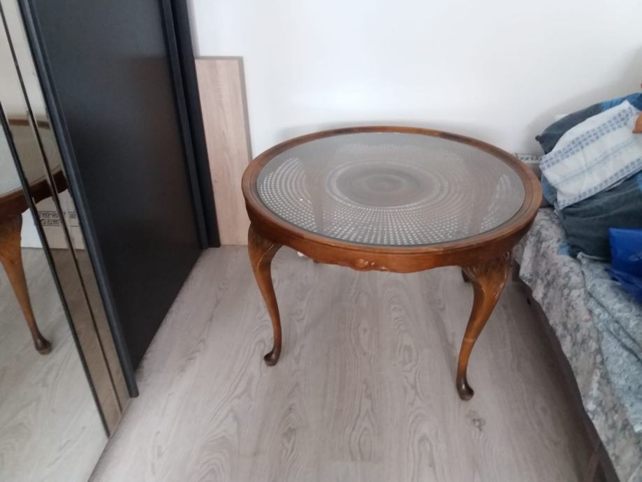 Prodaje se uščuvani okrugli drveni stol sa staklom.