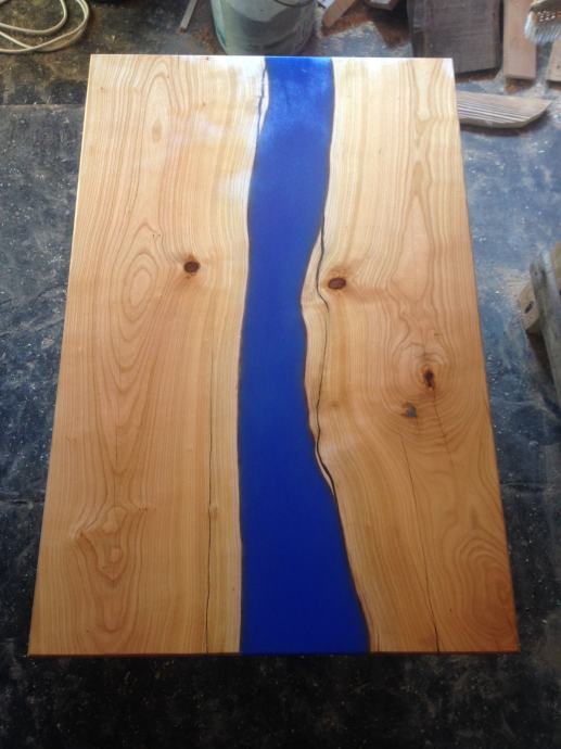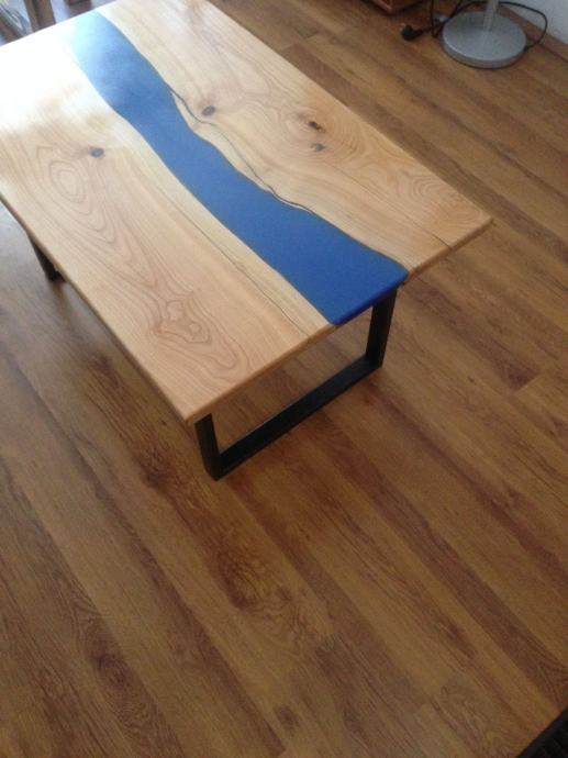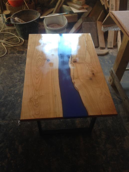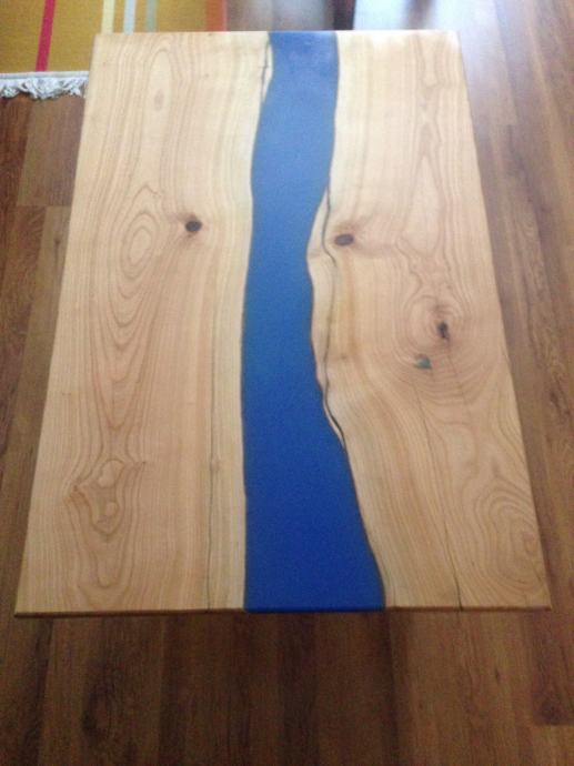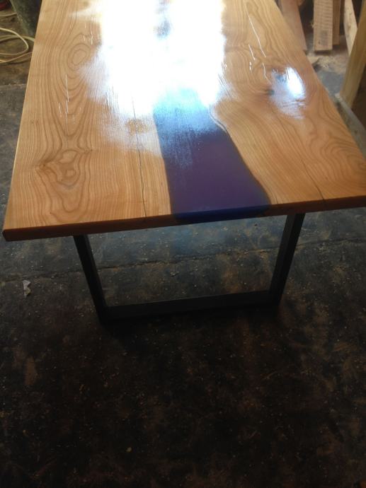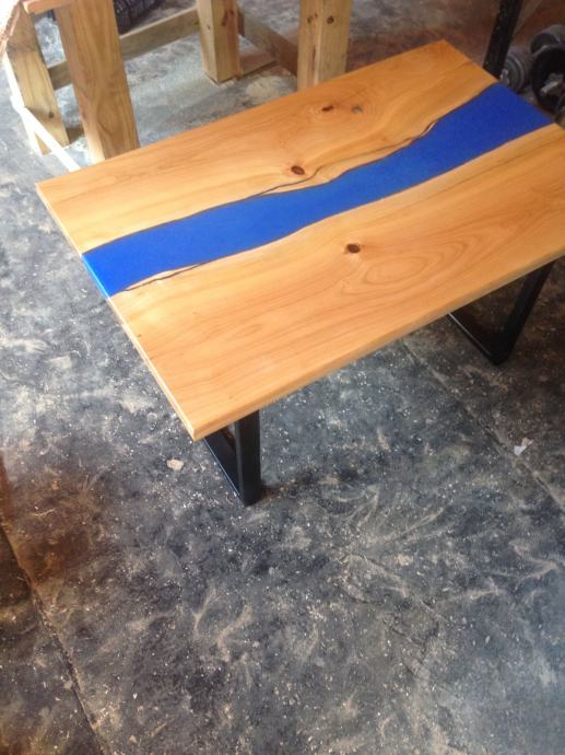 Unikatni stol kombinacija drvo tresnje i epoxy smole, željezne noge. Velicina 90x60x3cm