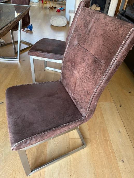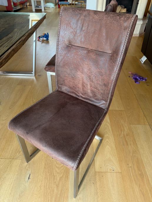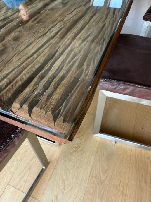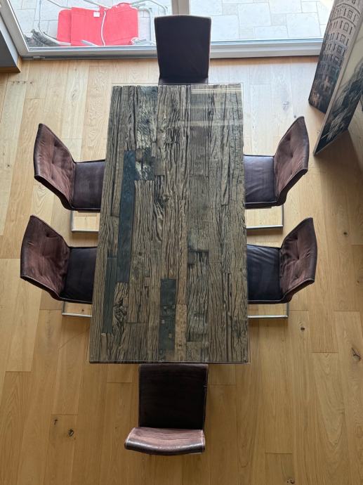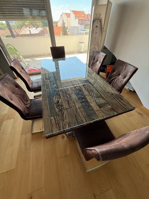 Veliki blagovaonski stol od “željezničkih pragova” sa staklenom stijenom (novi u Lesnina 599eur) i 6 stolica kožnih , sve uredno, prodajemo zbog preseljenja