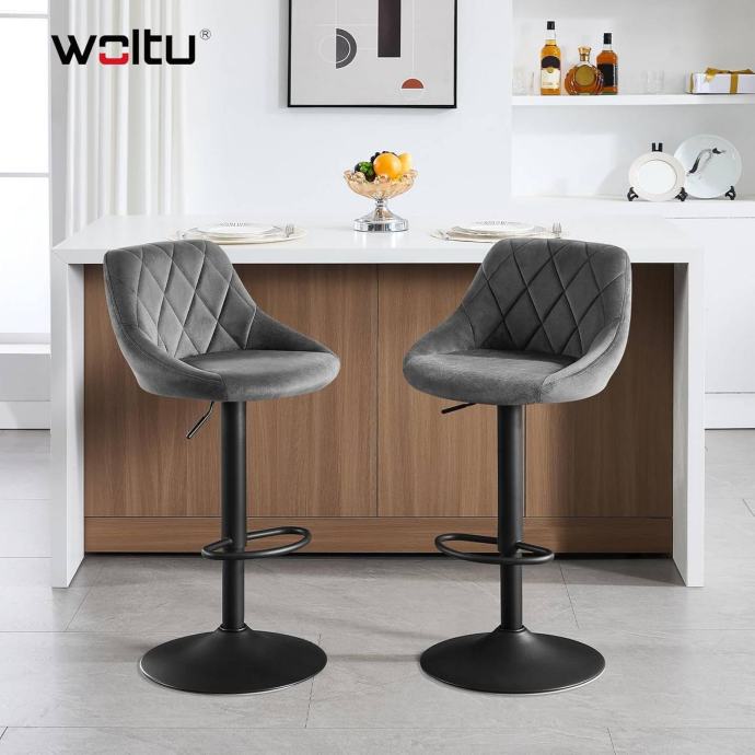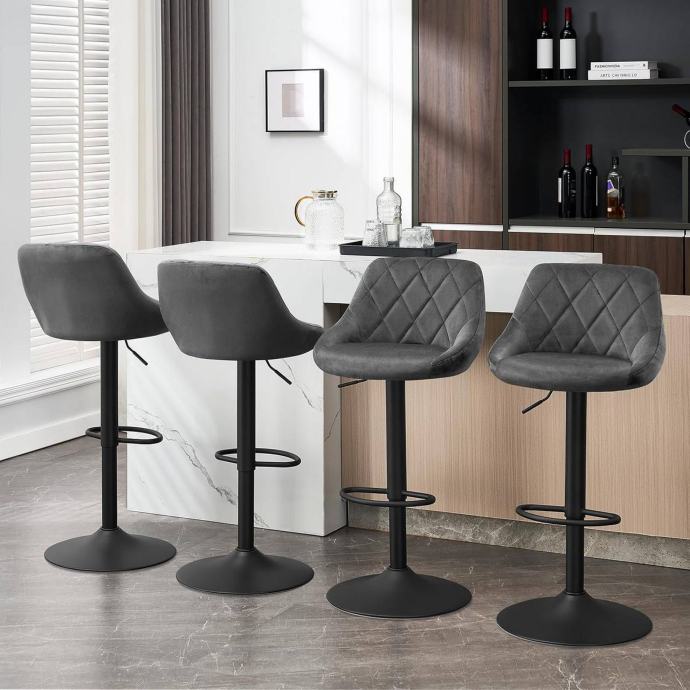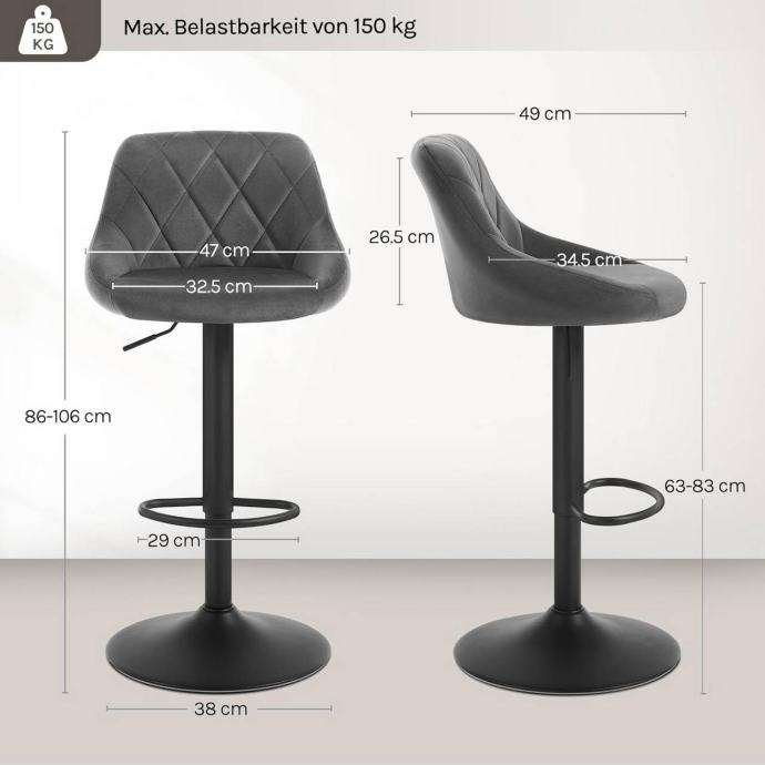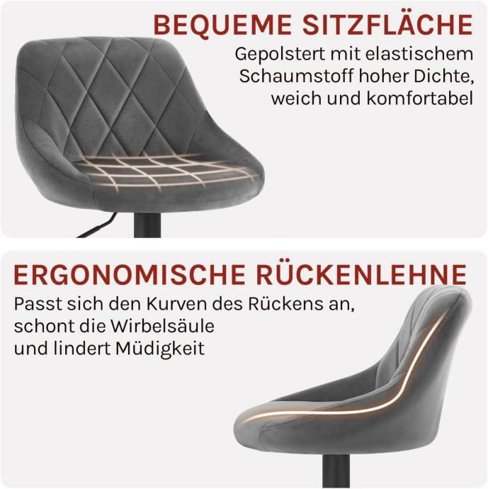 Ovaj barski stolac dizajniran je za udobno sjedenje i dugotrajnu upotrebu. Sjedište od baršuna i visokokvalitetne guste pjene pruža mekoću i pravilnu potporu za leđa i noge. Podesiva visina sjedišta između 63 i 83 cm omogućuje prilagodbu različitim stolovima i kuhinjskim šankovima.