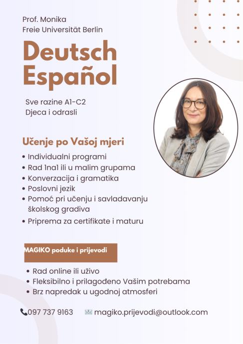 Moje ime je Monika, izvorna sam govornica te profesorica njemačkog i španjolskog jezika.