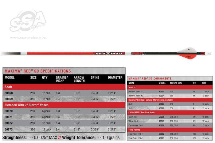 The new Maxima RED® SD is a breakthrough in controlling Dynamic Spine in a smaller diameter (.203"ID) shaft. The new, high-tech carbon arrow shaft design has stiffer ends to contain the arrow's flex to what we call the RED ZONE®. The RED ZONE is the section of the arrow shaft engineered to contain Dynamic Spine and make a broadhead shoot more consistently. The smaller diameter Maxima RED® SD delivers improved penetration and reduces wind-drift which enables more accurate shots at longer distances. - Matched Set: All Maxima RED® SD 6- and 12-pack sets are sorted and matched by weight and spine for best-in-class consistency. Spine selection sorting tolerance is +/- 0.0025". Weight sorting tolerance is +/- 1.0 grains. - Real Straightness: Every Maxima RED® SD arrow is laser checked for straightness to a remarkable 1/10,000 of an inch. Maxima RED SD straightness of +/- 0.0025" is a maximum measurement, not an average.Spine: 335