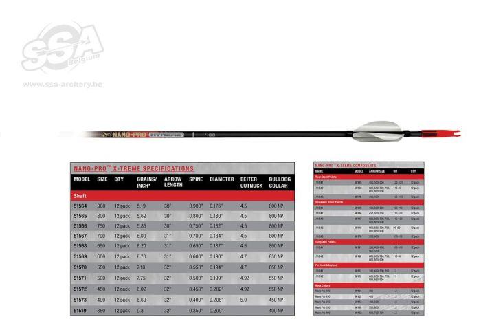 Nano-Pro™ X-Treme™ is specifically engineered for today's competitive recurve bows. When the difference of success can be that of mere millimeters in FITA, NAA and NFAA long-distance field shooting, the Nano-Pro X-Treme is sure to deliver pinpoint accuracy as a result of its multi-spine construction. With this design, the Nano-Pro X-Treme recovers faster out of the bow while delivering the flattest trajectory and superior down range accuracy. Keeping true to form of the Nano-Pro™ series, it has the smallest diameter of any of our target arrows coupled with the parallel shaft design to virtually eliminate cross-wind drift. Contrary to aluminum core arrows, the Nano series won't take a set (permanent) bend, and consistently hold their initial spine tolerance for several seasons. - Advanced Technology. RedZone Technology - Straightness: ± 0.0015" - Weight Tolerance: ± 1.0 grains - Spine Selection Tolerance: ± 0.002"Spine: 800