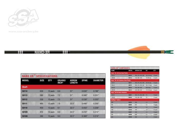 The Nano-XR™ was the first target arrow engineered from 40-ton carbon to deliver superior downrange accuracy, strength and consistency shot after shot. Its ultra-small diameter dramatically reduces cross-wind drift and is the ideal arrow for FITA, NAA and NFAA long-distance shooting. In side-by-side tests, the Nano-XR consistently out-performed comparable aluminum core carbon arrows in durability, recovery out of the bow, consistency and velocity. - Advanced Technology. Extreme Accuracy - Straightness: ± 0.0015" - Weight Tolerance: ± 1.0 grains - Spine Selection Tolerance: ± 0.002"Spine: 490