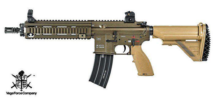 Licencirana HK416 replika u RAL8000 boji. Full metal, autentične oznake, jedinstveni serijski broj. Unutrašnjost 8mm ležajevi, MOSFET integriran u školjku gearboxa, hopup komora novog tipa (jedan kotačić sa zupcima).