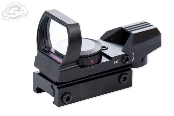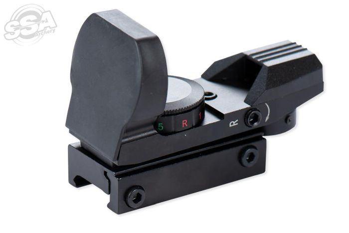 Holographic sight from Junxing.Aiming dot in three different shapes.Red or green aiming dot.5 different intensities per color.Sight mounts on picatinny rail.Horizontal and vertical adjustable with hex key. Incl. battery CR2032.