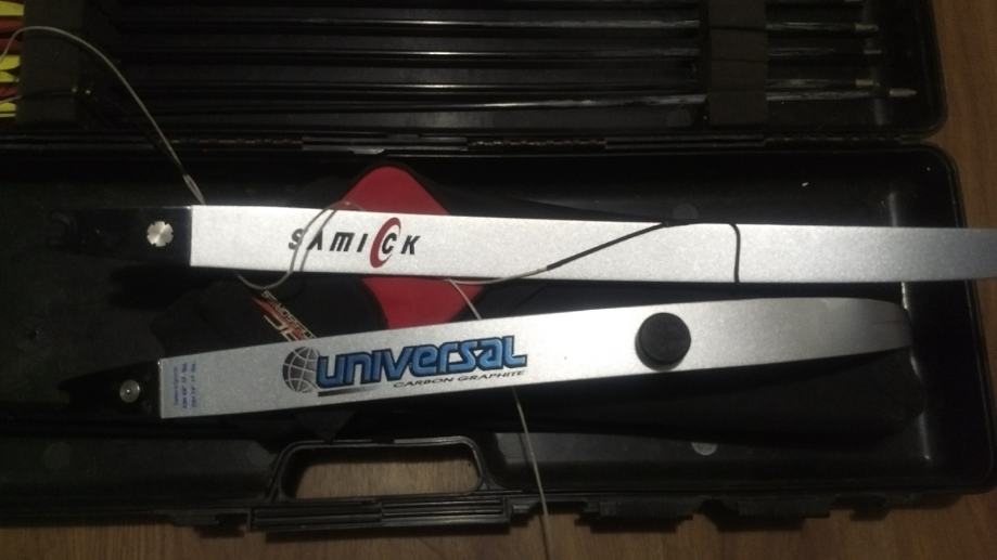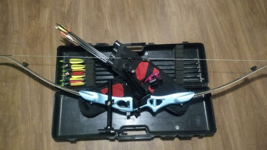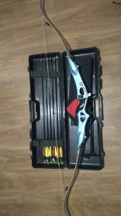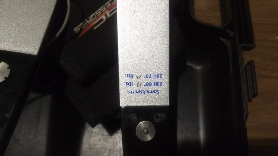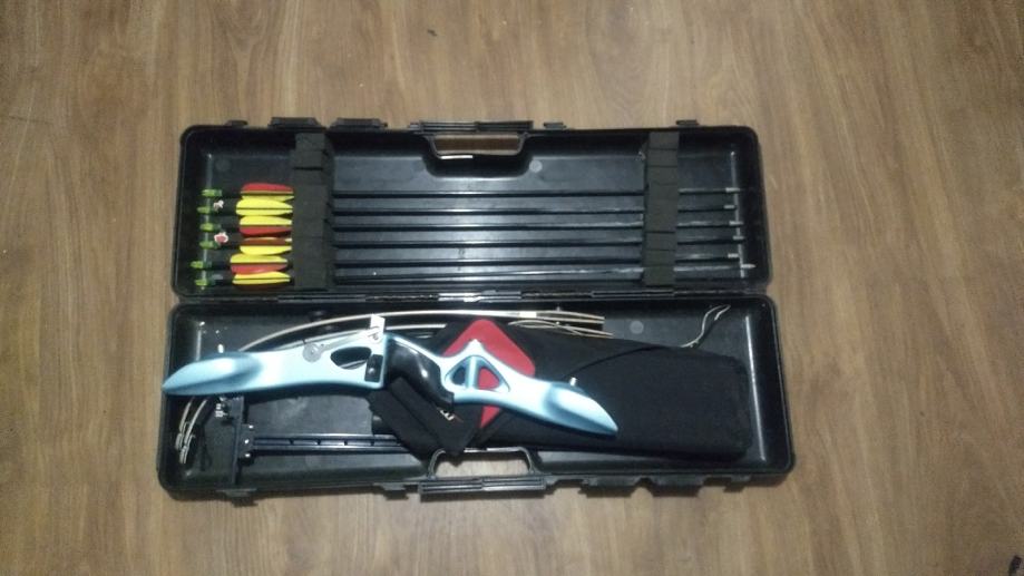 Štitnik za ruku i tab za prste. Dvije tetive dodatni rest za strijelu. Cartel nišan, klicker i plunger te kovčeg za sve. Krakovi su karbonski i bez ikakvih oštećenja.