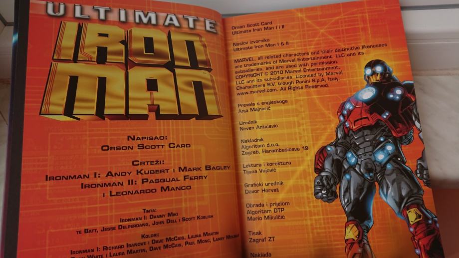 Iz pera jednog od najuspješnijih SF-pisaca današnjice, Orsona Scotta Carda – četverostrukog dobitnika nagrade Hugo, dvostrukog dobitnika Nebule – dolazi nam priča o Tonyju Starku, svima poznatom utjelovitelju Iron Mana. Card nam je priču odlučio ispričati baš ispočetka, od dana kada su se njegovi otac i majka upoznali. Tony Stark kakvog ga poznamo iz filmova, u ovom je crtanom romanu tek dječak koji odrasta na posebno neobičan način, njegove umne i tjelesne sposobnosti rezultat su genetike dvaju genijalnih roditelja, ali i čudovišnog nesretnog slučaja koji će mladog Starka ostaviti djelomično invalidom, djelomično superherojem. A lukavih i beskrupuloznih neprijatelja u dobrim pričama uvijek ima napretek. U ovom deluxe izdanju na 240 stranica sabrani su nastavci 1 i 2 Marvelove Ultimate Iron Man edicije. Briljantne crteže potpisuju Andy Kubert, Mark Bagley, Pasqual Ferry i Leonardo Manco, a kolore Richard Isanove i Dean White.