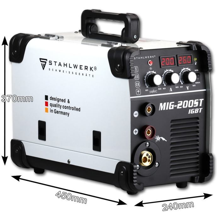 Lagan i kompaktan dizajn - S težinom od samo 11,8 kg i dimenzijama 450 x 240 x 370 mm, uređaj je idealan za zavarivanje na bilo kojem mjestu. Inovativni IGBT tranzistori štede prostor i težinu u odnosu na staru MOSFET tehnologiju. Nema teških nošenja!