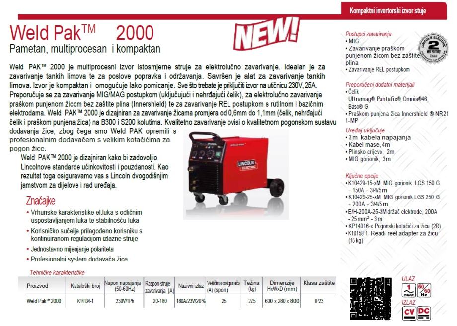 Weld PAK™ 2000 je dizajniran kako bi zadovoljio Lincolnove standarde učinkovitosti i pouzdanosti. Kao rezultat toga osiguravamo vas s Lincoln dvogodišnjim jamstvom za dijelove i rad uređaja.