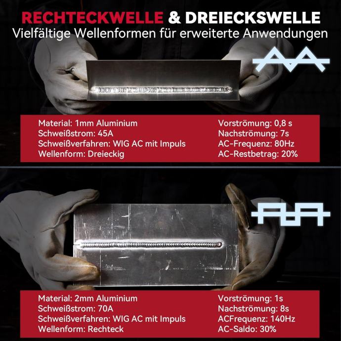 Služi za sprječavanje izgaranja materijala i minimiziranje deformacije materijala uzrokovane prekomjernim dovodom topline. Trokutasti val učinkovito smanjuje dovod topline, pa proces zavarivanja teče brzo. Idealan je za zavarivanje tankih metala. Pravokutni val može brzo mijenjati polaritet, pruža dinamičan luk i stabilno taljenje, duboki ulaz u metal i ima snažnu sposobnost čišćenja slojeva aluminijevog oksida, što omogućuje preciznije zavarivanje aluminija ili aluminijskih legura