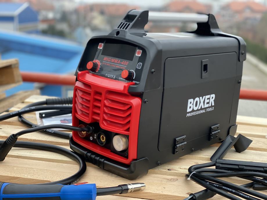 Aparat za zavarivanje BOXER BX SR 2006 - IGBT- je poluautomatski aparat za zavarivanje niskougljičnog, niskolegiranog čelika (MAG), legiranog čelika (MIG), aluminijskih legura itd. .Trenutno, jedan od najmanjih aparata za zavarivanje sa dolje navedenim karakteristikama. Prikladan za zavarivanja na terenu , bravarskim radionicama, servisnim radionicama, industrijskim radionicama, itd. Zahvaljujući sinergističkim postavkama, uređaj je vrlo jednostavan za uporabu i može ga koristiti zavarivač sa minimalnim iskustvom. Uređaj se može koristiti za MMA zavarivanje pomoću elektroda kao i za TIG postupak. Izvor napajanja izgrađen je na IGBT tranzistorima poznate marke TOSHIBA . Zahvaljujući korištenju suvremene inverterske tehnologije usprkos malim dimenzijama, ovaj aparat omogućuje zavarivanje sa MIG / MAG / FCAW / TIG postupcima strujom do 200 ampera i MMA postupkom do 180 ampera. Aparat je opremljen EURO utičnicom - najčešće korištenim priključkom.